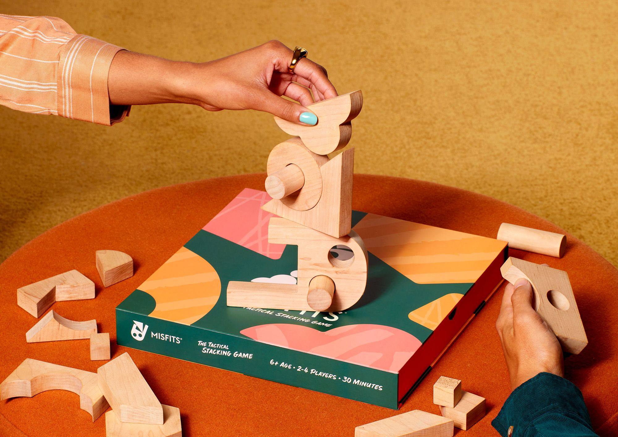 The first player places a starter block onto a flat surface. Thereafter, no blocks can touch the surface — the only exception is a shape placed inside a hollowed-out block. Players stack blocks on top of this starter block to create a tower.