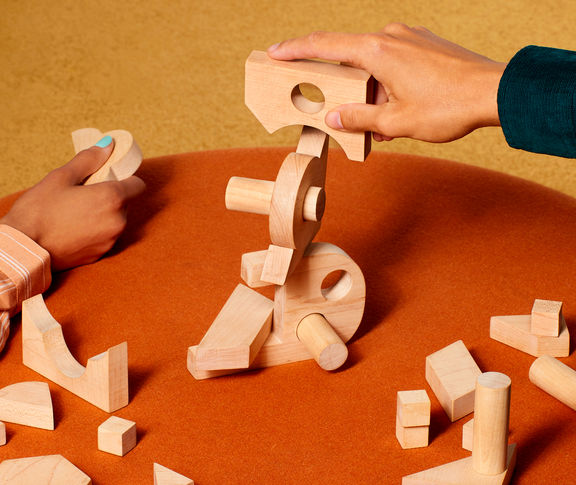 The first player places a starter block onto a flat surface. Thereafter, no blocks can touch the surface — the only exception is a shape placed inside a hollowed-out block. Players stack blocks on top of this starter block to create a tower.